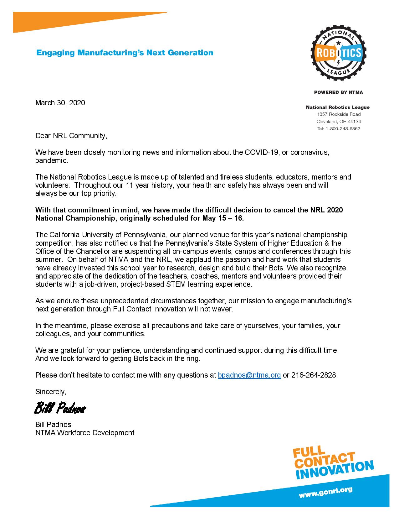 Both NTMA and NRL applaud the incredible dedication of everyone involved in this event, and we appreciate your patience during this very challenging time. Our mission to provide a project-based STEM learning experience, and to prepare and engage manufacturing’s next generation, will not waver. We hope to see Bots back in the ring as soon as possible, and look forward to returning to California University of Pennsylvania for the NRL National Championships in 2021.